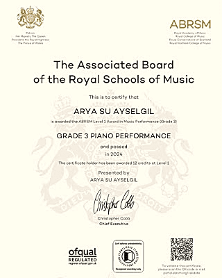 Öğrencim Arya Su Ayselgil’in aldığı Royal Akademi ABRSM Sertifikası